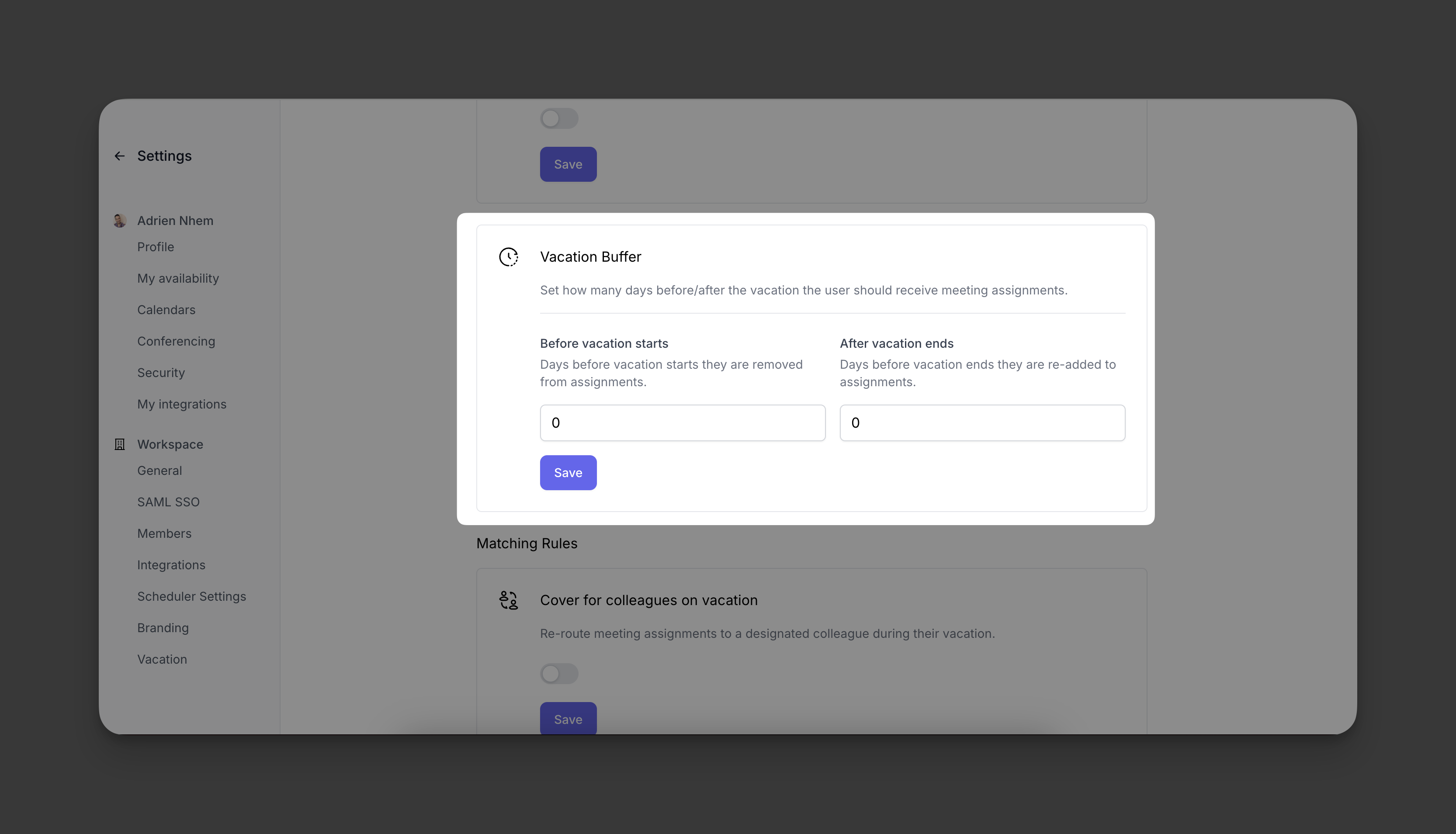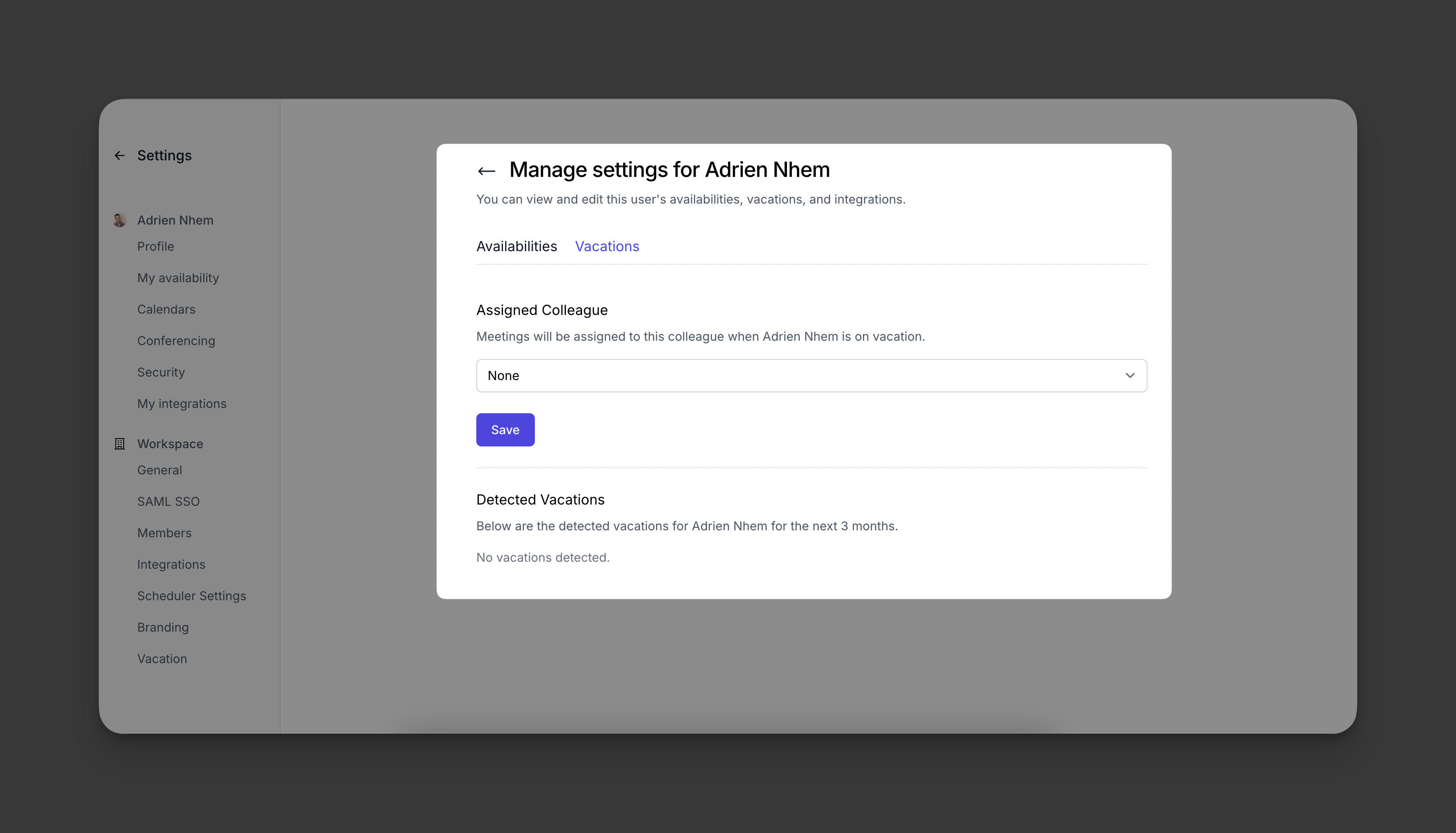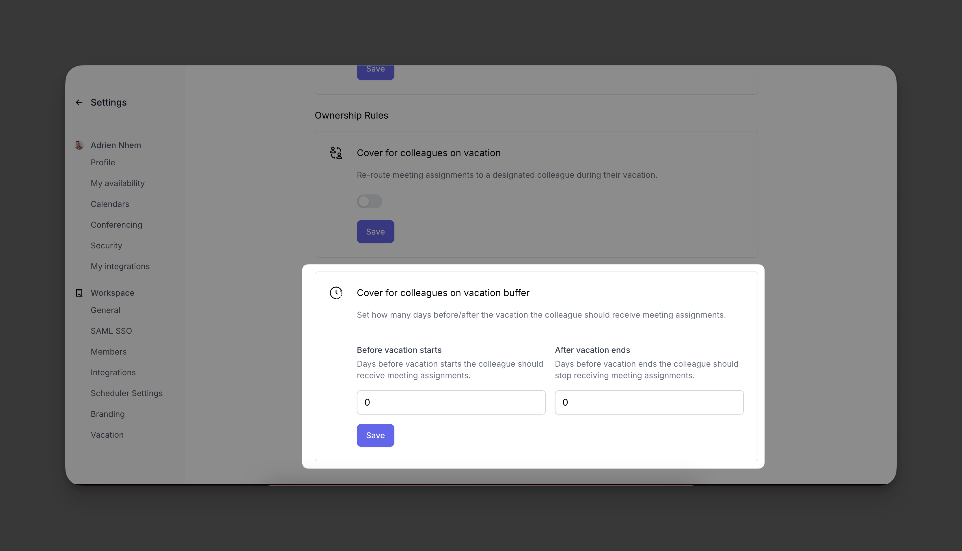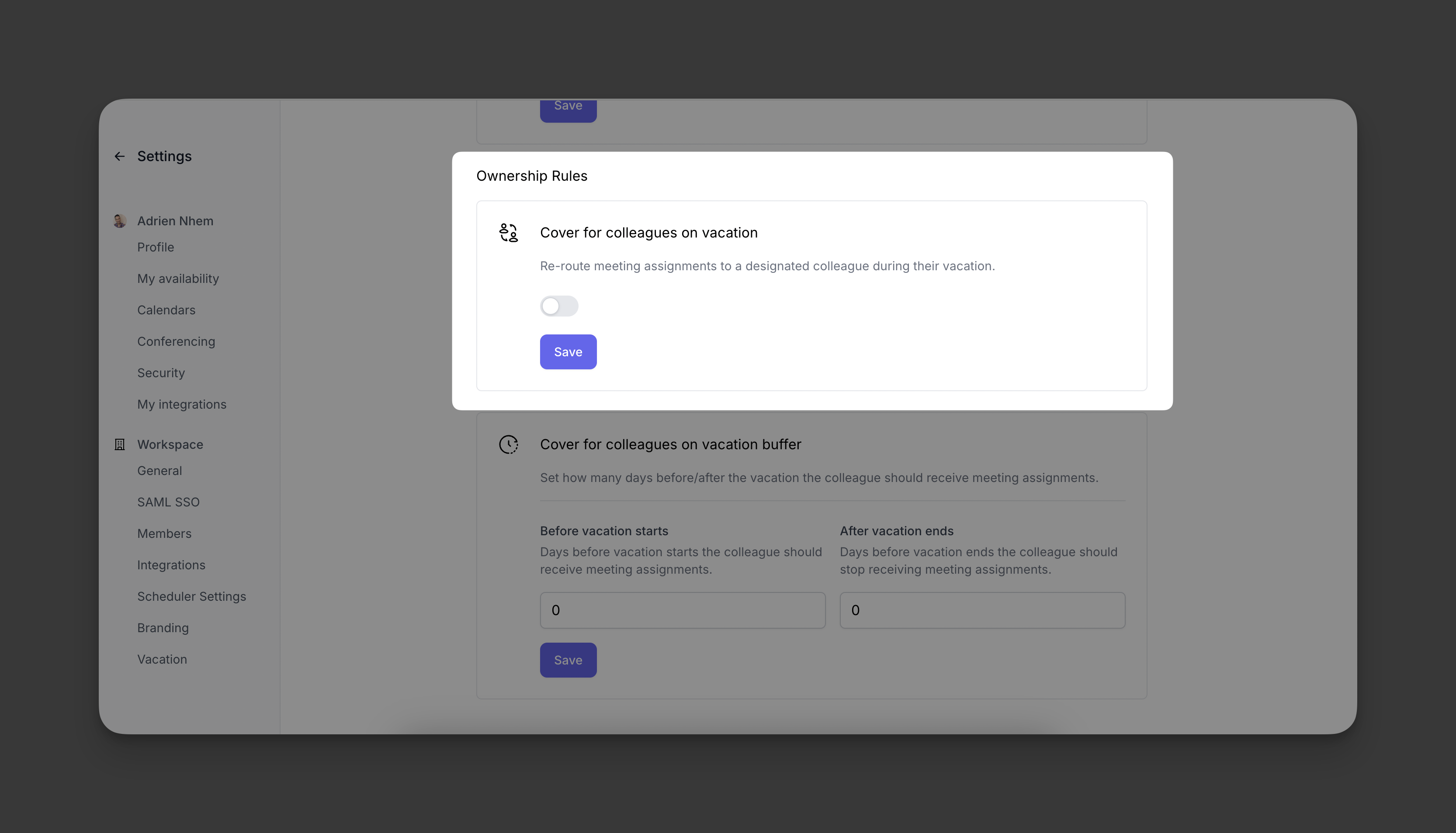 Toggle the Cover for colleagues on vacation setting if you want to re-route meeting assignments to a designated colleague during their vacation.