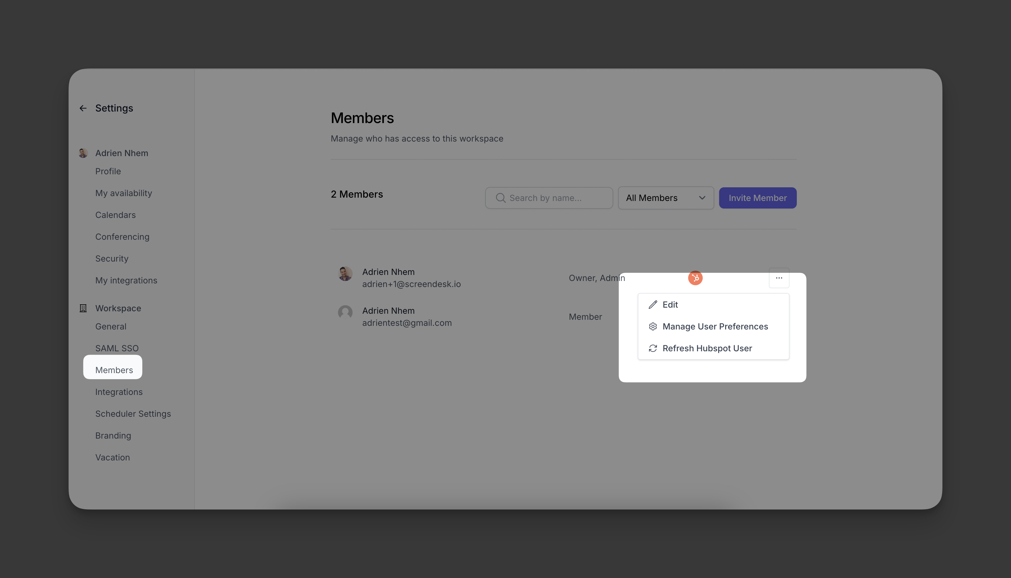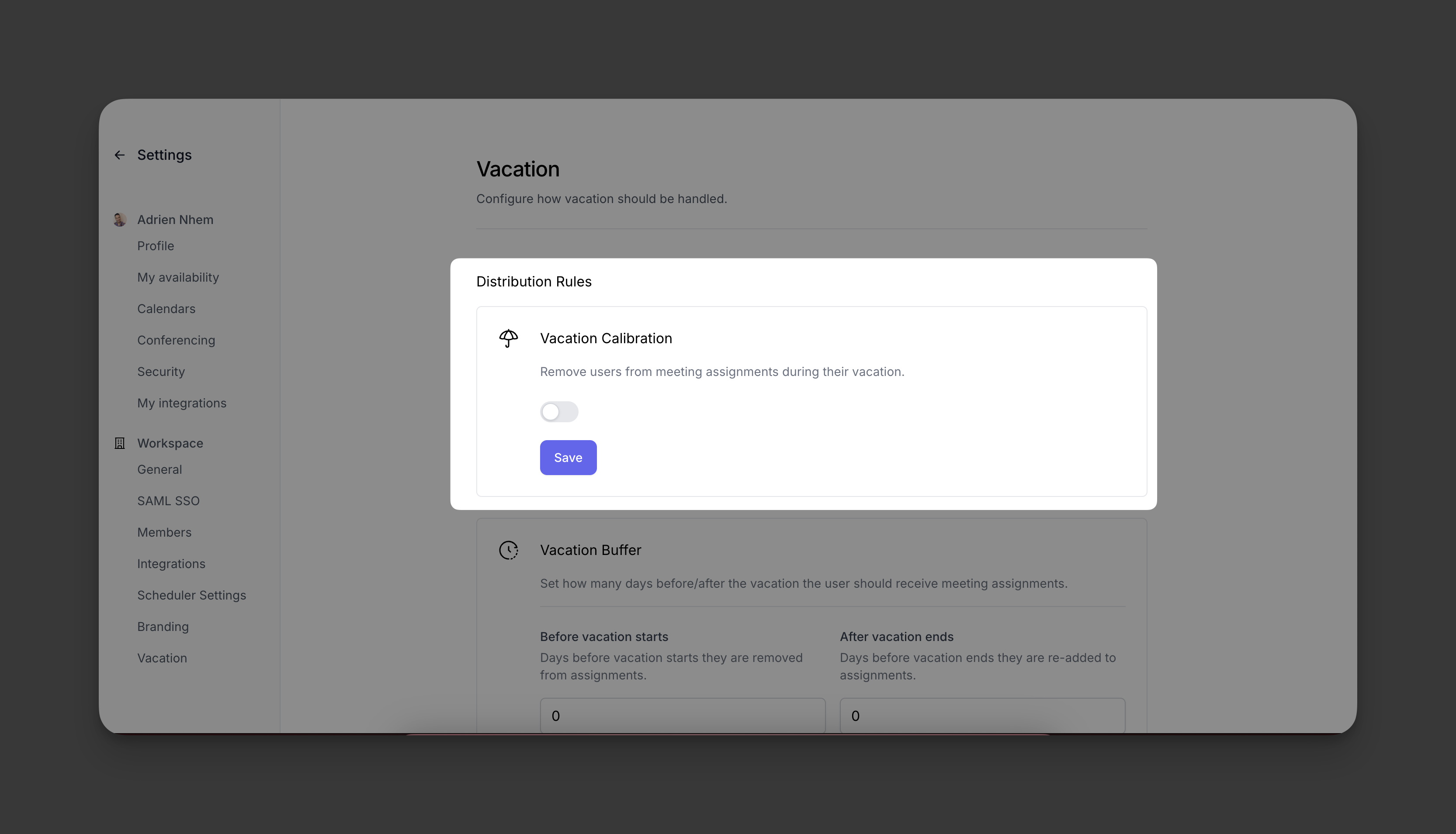 Toggle the vacation calibration setting if you want to remove users from metting assignments during their vacation.
