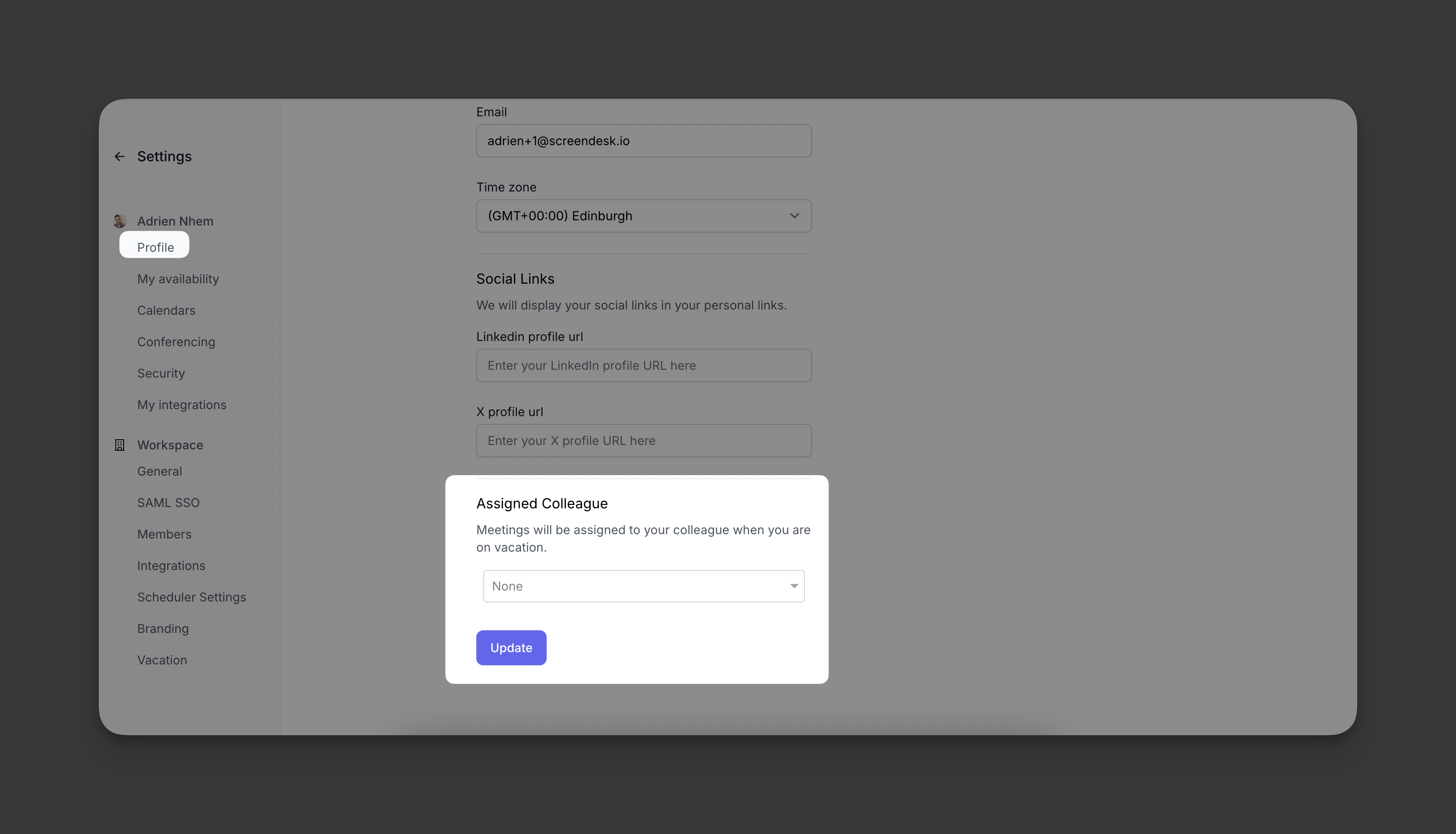 Users can set up a colleague themselves. Head to Settings -> Profile
